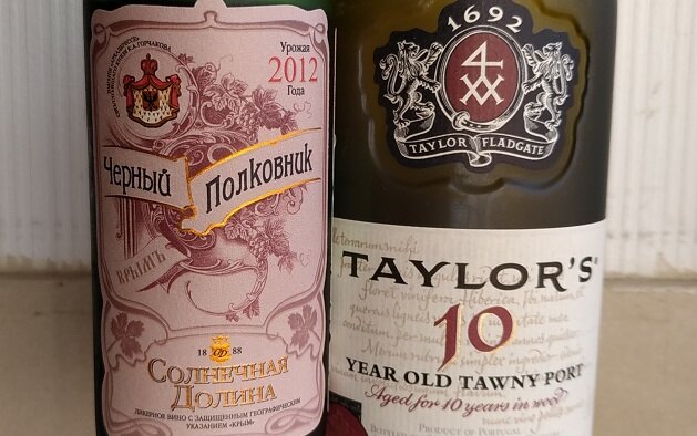 Taylor's, можно сказать, один из самых крутых, если не самый крутой из домов портвейна. А "Чёрный полковник" одно из самых интересных, если не самое интересное, ликёрных вин России. Почему бы и не сравнить? Не знаю, нуждается ли в представлении "Чёрный полковник" (ЧП) старинного крымского производителя "Солнечная Долина". Изготавливают его из ряда местных и международных сортов: одесский чёрный, бастардо, каберне-совиньон, джеват-кара и кефесия. Джеват-кара и означает чёрный полковник. Вино меньшей, чем портвейны, крепости, 17,5%, примерно такое же, как и портвейны, по содержанию сахара, 110 граммов на литр. Урожая 2012 года, розлив в 2021 году, то есть, 8 с лишним лет в бочках. Участник многочисленных сравнений в моём блоге, из которых очень часто выходил победителем, потому я и повышаю ставки и сравниваю его со всё более и более серьёзными портвейнами. Как сейчас. Потому что Taylor's самый... Нет, конечно. его нельзя назвать самым лучшим или единственным лучшим. Но зато он, как прави