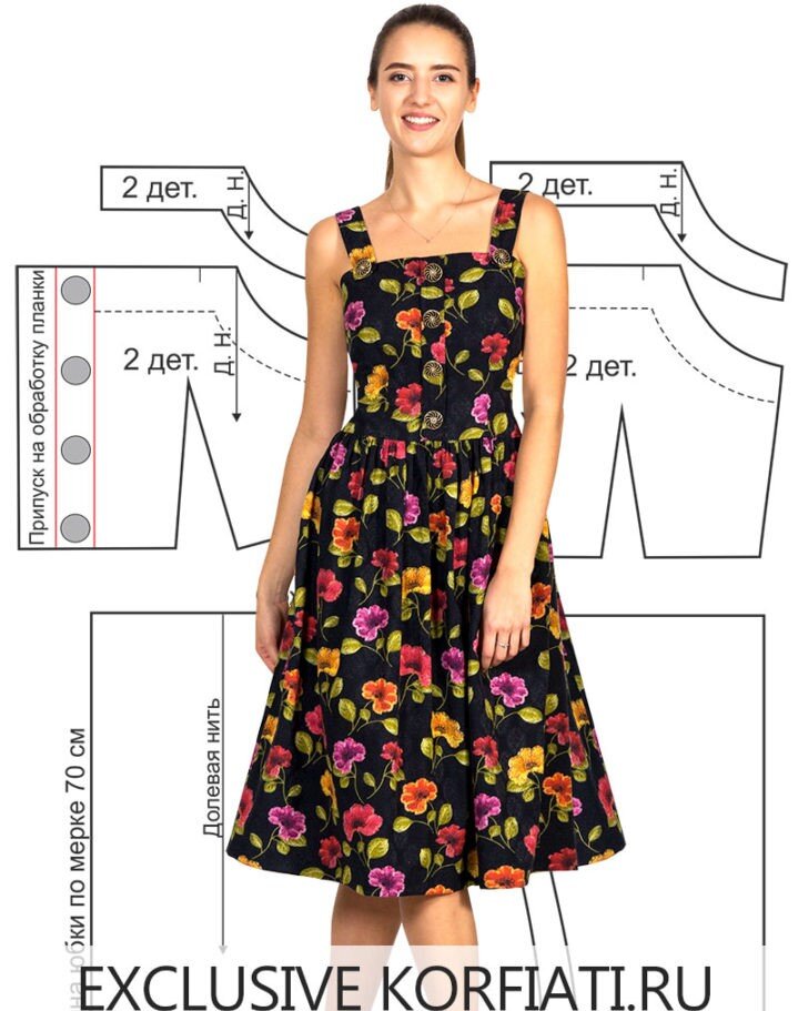 Для пошива этого сарафана рекомендуется использовать: жаккард, коттон, пике и другие ткани, держащие фору.