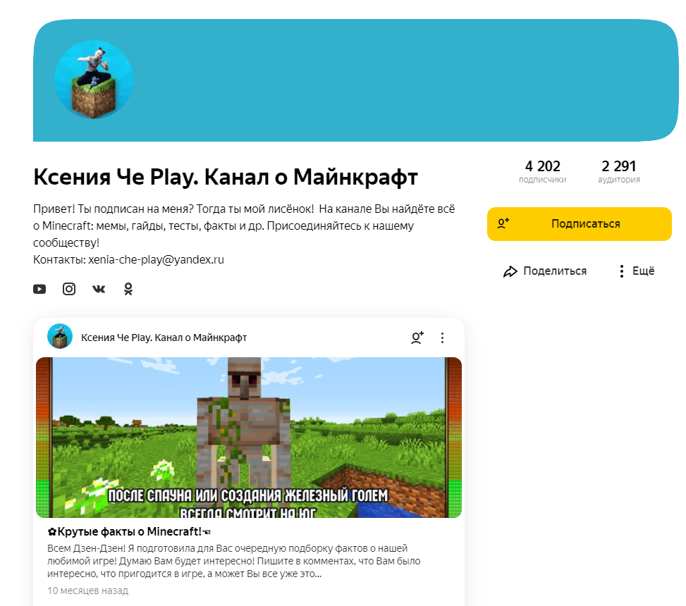 Привет! У каждого канала на Дзене есть автор (или группа авторов) - они пишут статьи, снимают видосики и выкладывают галереи. Но бывает, что этого не происходит. Почему? Авторы ленятся или у них нет идей. С вами хвост и в этой статье я расскажу о 2-ух каналах, которые писали про Minecraft, но больше не хотят о нем знать. Ксения Че Play Последняя статья вышла в конце лета 2020, почти год назад. Ксения выпускала мемы (некоторые из них она сама делала), факты и короткие видео. Каждую неделю она составляла топ активных комментаторов. Я даже хотел в него попасть, но вот не задача - статьи перестали выходить. Видимо, зря я захотел попасть в топ) На YouTube канале видео о Minecraft не выходят, группы заброшены. А канал-то был хороший. Game Zone Автор писала не только про Minercraft, но и про другие игры. Последняя статья была про Minecraft error 402. Очень жуткая версия, которая может нанести вред психике. После той статьи, канал переименовался в "Весело и полезно". Выпускались короткие