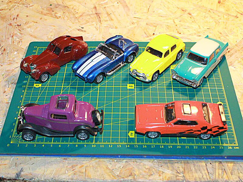 Смотрел я, значит, смотрел на Youtube всякое - и появилась у меня одна идея. Появилась она давно, поэтому при случае я заруливал в FixPrice и покупал там дешевенькие модельки машин, даже не столько модельки - сколько игрушки, ибо, насколько я знаю, тру-модели инерционных двигателей не имеют. Накопилась у меня вот такая коллекция: Пока идей четыре: - машина из постапокалиптического мира; - новогоднее авто,припорошенное снегом, с ёлкой на крыше и с подарками в салоне; - хувер-кар - то есть летающую машину - турбины, свисающие с днища кабели и шланги; - ну и красный спорткар в первом ряду переделать в нечто киберпанковское... Начинаем в авто из Вселенной Безумного Макса. Насколько я понял, это должно изображать Ford 3 window coupe 1932 года Для начала разобрал всё Подготовил корпус к кастомизации - убрал капот, крышку багажника и сточил окантовку люка Потом ещё чуть поработал - сделал моторный отсек, ободрал краску с половины кузова, не стал заморачиваться с растворителями, опы
