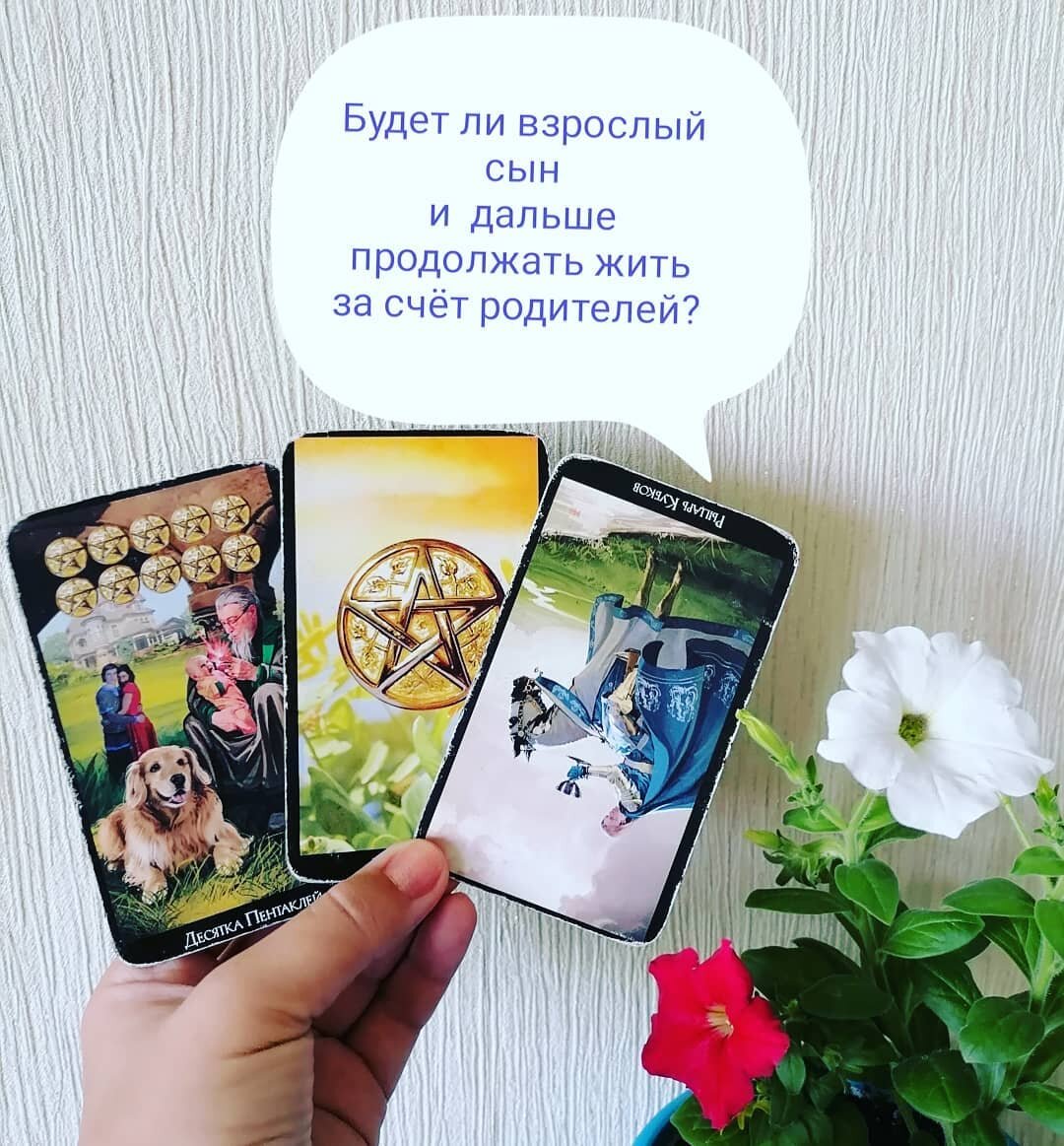 Разбираем. Несамостоятельного сына здесь представляет Рыцарь Кубков. Рыцарь смотрит на денюжку, которую здесь обозначает Туз Пентаклей. То есть Рыцарь (сын) идёт к денежной кормушке (Туз Пентаклей), которую предоставляют ему родители (10 Пентаклей). И пока эта денюжка мелькает у него перед глазами, зачем ему работать, трудиться, перенапрягаться? Родители все равно дадут.