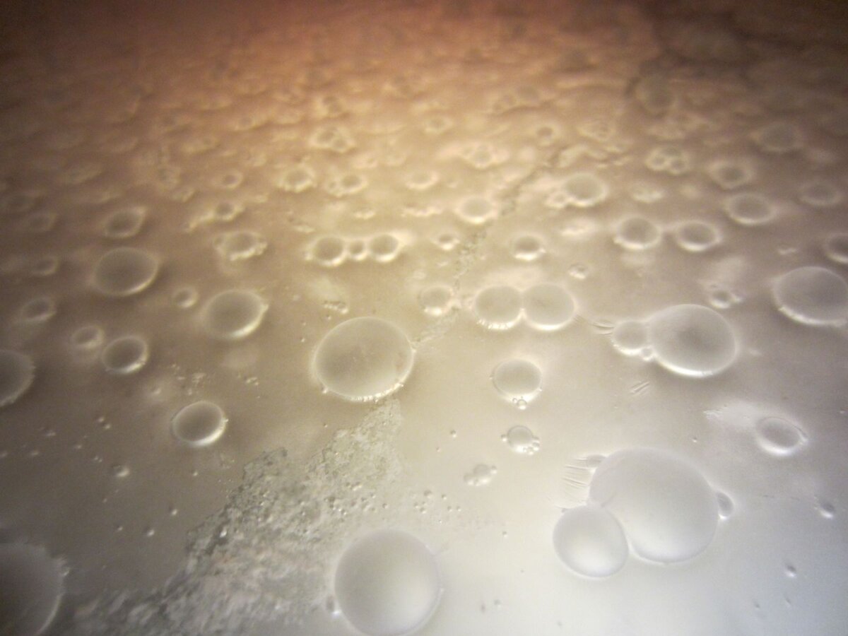 Но довольно семантики, иногда можно предположить было ли пиво сброженное обычными пивными дрожжами (Saccharomyces cerevisiae или Saccharomyces pastorianus) "заражено" какими-то другими нежелательными микроорганизмами просто внимательно на него посмотрев. Например типичная молочнокислая бактерия Lactobacillus (Лактобациллы) и иногда дрожжи Brettanomyces (Бреттаномицес) могут формировать пленку (защитный барьер) на поверхности пива, которая часто выглядит как слой белых или темных неподвижных пузырей покрытых пепельной пылью или пудрой как на фото ниже.