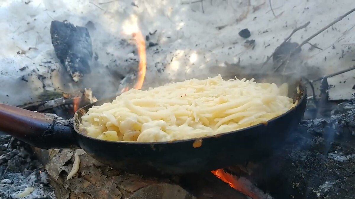 Всем привет) На природе аппетит разгуливается не на шутку и разумеется хочется перекусить что - то действительно сытное и вкусное. И картофельный гратен отлично подходит. Вам понадобится: - картофель; - лук репчатый; - чеснок; - сливочное масло; - сливки; - сыр Начнем) Нарезаем мелко лук и высыпаем в сковородку. Обжариваем на сливочном масле. Также режем чеснок и добавляем в сковородку. Пока лук с чесноком обжариваются, нам нужно почистить и порезать картофель и добавить в сковородку. Заливаем сливки , добавляем соль и перец. Ждем 15-20 минут и помешиваем. После того как картошка будет готова, добавляем натертый сыр. Приятного аппетита))) Также мы сняли видео приготовления блюда