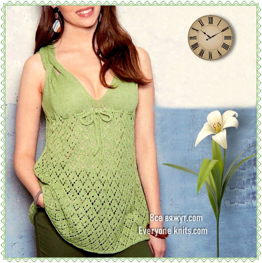 22. Топ прямого силуэта с V-образным вырезом связан спицами ажурным узором. Продетая кулиска подчёркивает линию лифа. Край горловины декорирован узором, выполненным крючком.