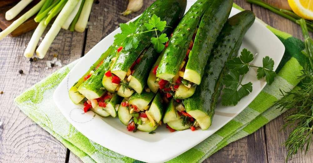 Эти малосольные огурчики будут готовы к подаче на стол уже через 3-4 часа. А если нарезать мельче, то просолятся ещё быстрее. Конечно, эффектно смотрится, когда они выглядят как фаршированные. Ну и если перец красный или оранжевый, то и смотрятся очень выигрышно. Хотя, именно зелёный грунтовый перец имеет более сильный перечный аромат по сравнению с красным. Я сегодня готовлю такие огурцы именно с невзрачным зеленым грунтовым перцем. Ингредиенты: 1/2 кг огурцов 1 болгарский перец 5 зубчиков чеснока 1 ст. л. соли зелень укропа и петрушки по вкусу У огурцов срезаю кончики и надрезаю их не до конца на четвертинки. Солю огурцы и внутри, и снаружи. Зелень мелко рублю, чеснок тоже измельчаю. Очищенный от семян перец стараюсь нарезать самыми маленькими кубиками. Перец, чеснок и зелень соединяю и перемешиваю. Я часть чеснока заменила чесночными стрелками. В контейнер укладываю огурцы как бы начиняя их, пересыпаю зеленью с чесноком и перцем. Убираю огурцы в холодильник. Это обычный вариант зас