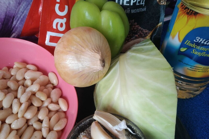 Привет Всем! Этот рецепт тушеной капусты с фасолью на самом деле очень простой. Если у вас в холодильнике найдется немного капусты, лука и зелени, то вы легко и быстро сможете приготовить тушеную капусту. А добавив в тушеную капусту банку готовой консервированной фасоли и специй, вы получаете тушеную капусту с фасолью. Поэтому это блюдо под силу даже человеку совсем уж далекому от кулинарных подвигов. Даже если вы никогда не готовили ничего сложнее яичницы, попробуйте приготовить такое простое блюдо. И у вас обязательно должно получиться! Я уверена! Тушеная капуста с фасолью. Продукты Тушеная капуста с фасолью. Пошаговое приготовление Для начала приготовим все овощи для тушения. Репчатый лук нужно очистить и нарезать произвольно, исходя из ваших предпочтений. Я, например, всегда очень мелко режу репчатый лук для любой тепловой обработки. С детства не любила жареный, тушеный и любой вареный лук. Постоянно сидела над тарелкой с супом и вылавливала его. Многим, наверное знакома такая карт
