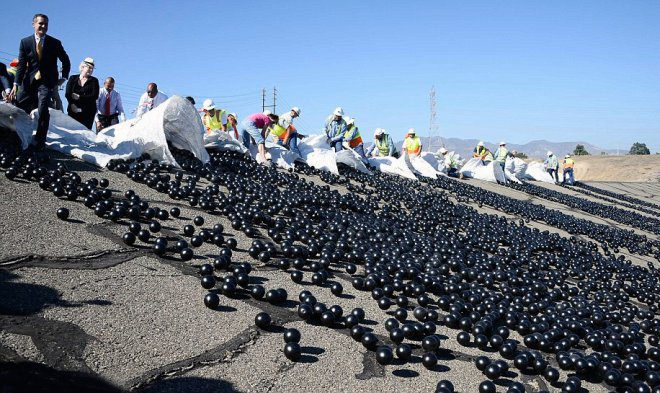 Вот уже несколько лет подряд штат Калифорния подвергается невиданной засухе, что привело к серьезному дефициту питьевой воды. Руководство штата всерьез задумалось о сохранении источников пресной воды от катастрофических испарений. Еще раз подтвердилась старая истина, что все гениальное просто. Идея использовать черные пластиковые шарики для защиты поверхности воды от палящих солнечных лучей принадлежит доктору Брайану Уайту – пенсионеру из Лос-Анжелеса после того, как он узнал о применении подобных шаров для отпугивания птиц в водоемах, расположенных вблизи взлетно-посадочных полос. Шары стоимостью 36 центов каждый по размеру чуть больше яблока. Черный цвет эффективно отражает ультрафиолетовые лучи. В настоящее время ими заполнены водохранилища Элизиан и Иванхо недалеко от городка Юппер Стоун. С помощью шаров удалось снизить интенсивность испарения на 85-90 %.