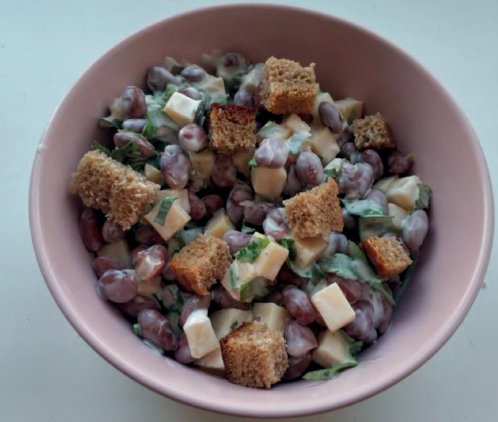 ИНГРЕДИЕНТЫ: Фасоль консервированная -1/2 банки Сыр - 50 г Чеснок - 1 зубчик Сметана - 30 г Зелень - 10 г Хлеб - 2 кусочка Соль - по вкусу ПРИГОТОВЛЕНИЕ: 1. Сыр нарезаем кубиком. Измельчаем чеснок и зелень. Смешиваем все ингредиенты. 2. Заправляем сметаной, добавляем немного соли и перемешиваем. 3. При подаче посыпаем сухариками. Сухарики делаем самостоятельно, порезав пару кусочков хлеба на квадратики и подсушив их 3-5 минут на сухой разогретой сковороде.