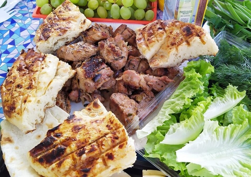 Приветствую! Как обычно, на майские праздники в этом году мы поехали на дачу открывать шашлычный сезон. По обыкновению заехали в магазин закупиться всем необходимым. Помимо обычного хлеба мы всегда берем еще и тонкий лаваш, уж больно хорошо в него завернуть кусочки шашлыка, добавить листья салата с зеленью и различными соусами. Смотрю, мой старый товарищ берет еще 3 лепешки грузинского лаваша. На мой вопрос: "Куда столько", он коротко ответил: "Увидишь". Он у нас большой и немногословный😉 . Закуски к шашлыку, как и хлеб, отличаются разнообразием и играют важную роль в хорошем застолье. Вообще, остывший магазинный лаваш, это банальная лепешка, как по мне. Но товарищ мой буквально преобразил его. Я так подробно рассказываю, потому что результат очень впечатлил меня. Поехали. Берем лепешку, смачиваем с обеих сторон водой. Немного наливаем в ладонь и распределяем по поверхности. Кладем на решетку. Если решетки нет, можно насадить на пару шампуров. Обжариваем лаваш на мангале с обеих стор