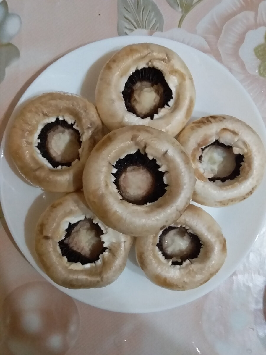 Здравствуйте, дорогие друзья! Сегодня поделюсь с вами рецептом простого и сытного блюда, которое можно подавать как закуску, или как отдельное блюдо. Для того, чтобы это блюдо получилось вкусным мы должны правильно выбрать грибы. Шампиньоны должны быть обязательно белого или слегка буроватого цвета. Потемневшие шампиньоны, с пятнышками и вкраплениями покупать не стоит, так как это свидетельствует о том, что грибы перезрели или долго пролежали в магазине, вкус у таких шампиньонов будет не очень, кроме этого они будут жёсткими. Если пощупать свежие грибы, они будут упругими и плотными. Также хорошие грибы имеют приятный грибной аромат, запах сырости означает, что их хранили неправильно, соответственно наше блюдо будет с таким же запахом. Для данного блюда мы выбираем грибочки примерно одинаковые по размеру, тогда они пропекутся равномерно. Начинять шампиньоны мы будем их ножками, которые почти всегда выбрасывают. Итак, что же нам потребуется для приготовления запечённых шампиньоно