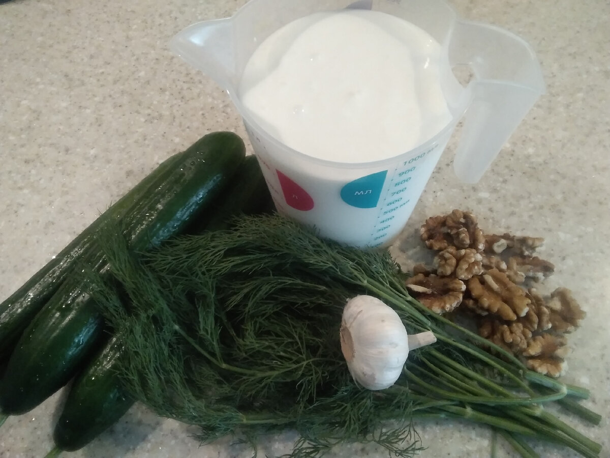 Этот суп – спасение для тех, кто в жару не знает чем и как накормить своих близких. Моя семья любит его больше, чем окрошку и свекольники, поэтому готовлю его часто. Хорошо охлаждает и в то же время достаточно калорийный. Готовлю суп вот так: Сначала нарезаю все. Огурцы мелкой соломкой, хорошо подходит укроп – тоже режу, чеснок через давилку, орехи нарезаю ножом – люблю, когда они чувствуются. Если покупаю чищенные, то обязательно заливаю кипятком минут на 5, промываю, а затем нарезаю. Отправляю все в кастрюлю и заливаю холодным кефиром, жирность кефира не имеет значения. Солю, перчу, добавляю немного растительного масла. И заключительный момент – развожу холодной питьевой водой (можно со льдом) до нужной консистенции. Готово! Приятного аппетита! Я готовлю вот в такой пропорции: Кефир 1,5 литра Огурцы 600 грамм Орехи грецкие 50-60 грамм Укроп большой пучок Чеснок 3 зубчика Соль перец на Ваш вкус Масло растительное 50 мл Вода холодная 2 стакана