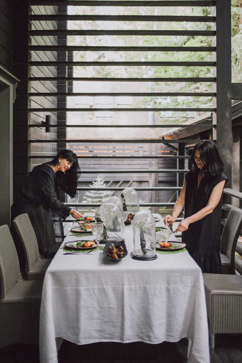 Сестры и основательницы Sisters' Design Илона Меньшакова и Ирина Маркидонова показали нам свой вариант летней сервировки на веранде. То, что нужно в жаркий день за городом. “Лето — это жизнь на природе, — начинают свой рассказ об этой сервировке дизайнеры. — И каждое лето мы используем все возможности по максимуму. Часто, встречая гостей, мы придумываем разные истории и соответствующее им оформление. Даже самая простая история может превратиться в грандиозную вечеринку. Конечно, вся готовка в эти моменты перемещается на летнюю кухню. За легким общением и бокалом вина на огне готовятся и свежая рыба, и сезонные овощи. А вот хлеб в этот раз мы решили обжечь прямо на столе, в чугунных лодках, на глазах у наших гостей. Так и родилась наша идея для декора стола. Брутальные обгоревшие поленья в сочетании с трогательными полевыми цветами под запотевшими стеклянными куполами притягивают взгляды собравшихся за столом. На тарелки мы разложили персики на гриле со страчателлой, базиликом и мятой.