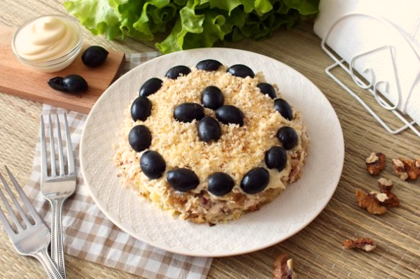 Салат Кабриолет оценит каждый кто любит вкусно покушать. В его составляющие идет копчёная курочка, она лучше всего сочетается с грибочками и грецкими орешками. Данный салат отлично зайдет на любой стол. Продукты: Как готовить салатик кабриолет Приготовим нужные продукты не крупными кубиками режем лук, на сковородке разогреваем две столовые ложки растительного масла и жарим лук до мягкого состояния режем наши грибочки не толстыми пластиками, после закидываем в сковородку к луку и жарим минут десять иногда перемешивая по готовности выкладываем грибочки в отдельную посуду и остужаем их на терке натрем предварительно отваренный картофель выкладываем на блюдо для подачи и промазываем майонезом копченую курочку режем на не крупные кубики и кладем ее поверх картофеля после курочки необходим еще слой майонеза, а после выкладываем наши обжаренные грибочки поверх грибочков натрем на мелкой терке сыр сыр сверху смазываем еще одним слоем майонеза, а после посыпаем дробленым грецким оре