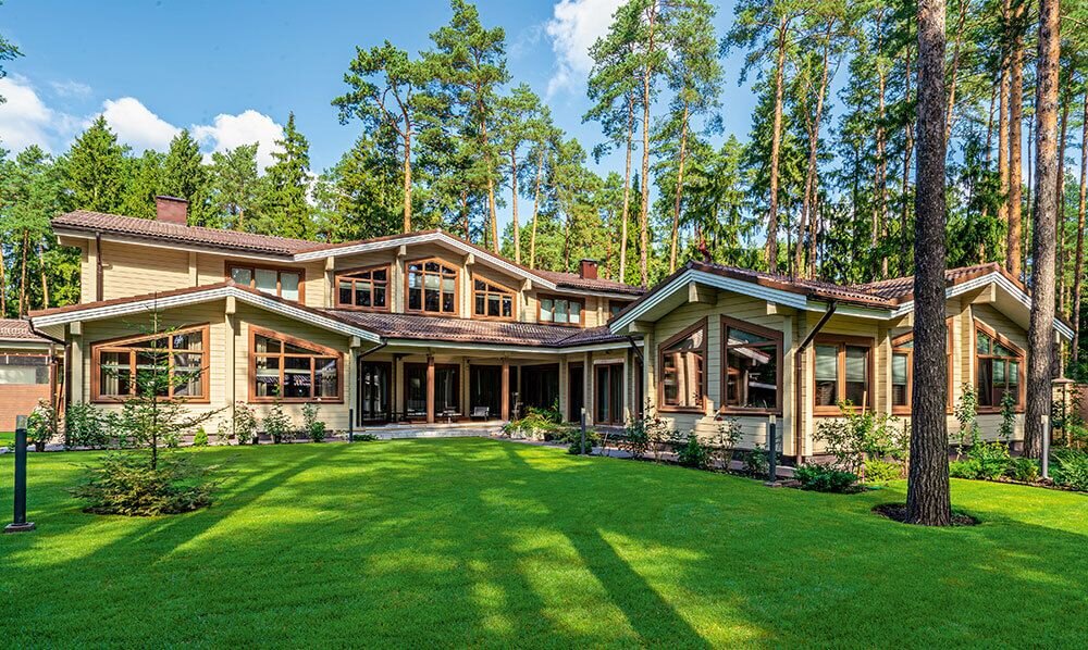 Автор проекта: архитектор-дизайнер Сусанна Хегай Архитектура двухэтажного дома с уютным внутренним двором напоминает город в миниатюре: здесь все помещения составляют единый ансамбль, а большая площадь остекления делает пространство визуально шире. Дом возведен из клееного бруса на свайно-ростверковом фундаменте, его скатная крыша выложена керамической черепицей. Владельцы участка, расположенного в одном из стародачных поселков Подмосковья, очень гостеприимны, и площадь, на которой могли бы не только свободно разместиться, но и с комфортом отдохнуть семья и гости, им требовалась немаленькая. Проектом изначально была предусмотрена планировка, оптимально соответствующая запросам заказчиков. Центральную часть первого этажа занимает общая зона с просторным холлом, гостиной, столовой и кухней. В правом блоке оборудованы технические помещения с котельной, кладовой и постирочной, в левом