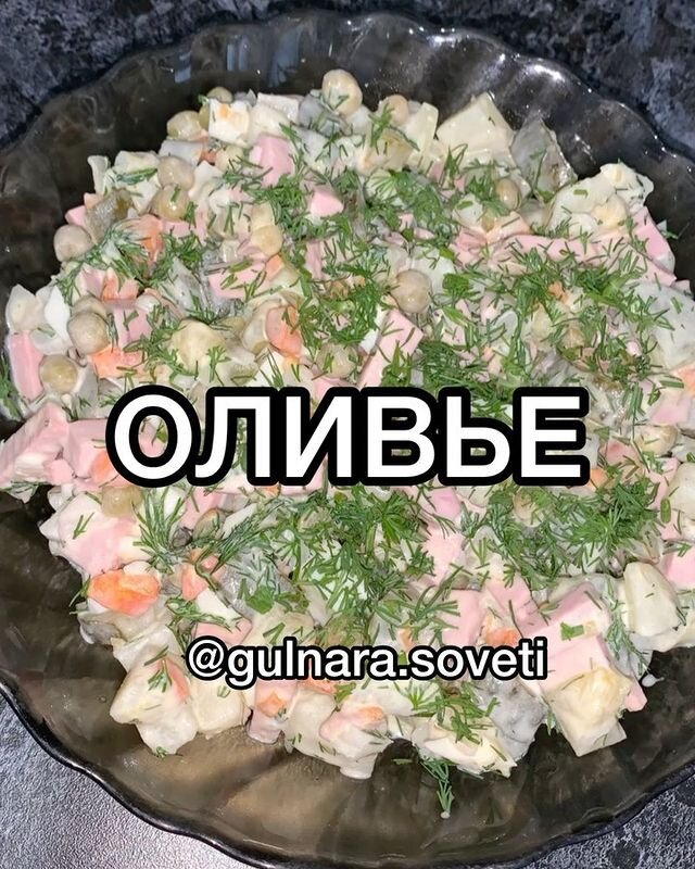 Салат оливье — король салатов. Любой мужчина скажет: нет салата оливье, значит, нет праздника. Рецепт салата оливье имеет много разновидностей, поэтому каждый в зависимости от своих вкусов и предпочтений в еде может выбрать, как приготовить салат оливье. ИНГРЕДИЕНТЫ: 🌷Колбаса вареная ("докторская" или молочная) - 200 г 🌷Картофель - 5 шт. 🌷Морковь - 1 шт. 🌷Яйца куриные - 6 шт. 🌷Огурцы солёные - 2-3 шт. 🌷Горошек консервированный зеленый - 200-300г 🌷Зелень (по желанию) - по вкусу 🌷Лук 1шт 🌷Соль - по вкусу 🌷Перец - по вкусу 🌷Майонез - 200-300 г (по вкусу ПРИГОТОВЛЕНИЕ: 1.Картофель, яйца и морковь тщательно промыть и отварить в кастрюльке. 2.Картофель, морковь, огурцы, колбасу и яйца нарезать кубиками. 3.Зелень помыть, мелко нарубить. 4.Добавить зелёный горошек, предварительно слив воду. 5.Все ингредиенты соединить в миске. Посолить, поперчить, заправить майонезом. . А Вы как готовите ОЛИВЬЕ 🥗❓ Если пост был полезный, то обязательно ➕сохраняйте и ставьте лайк