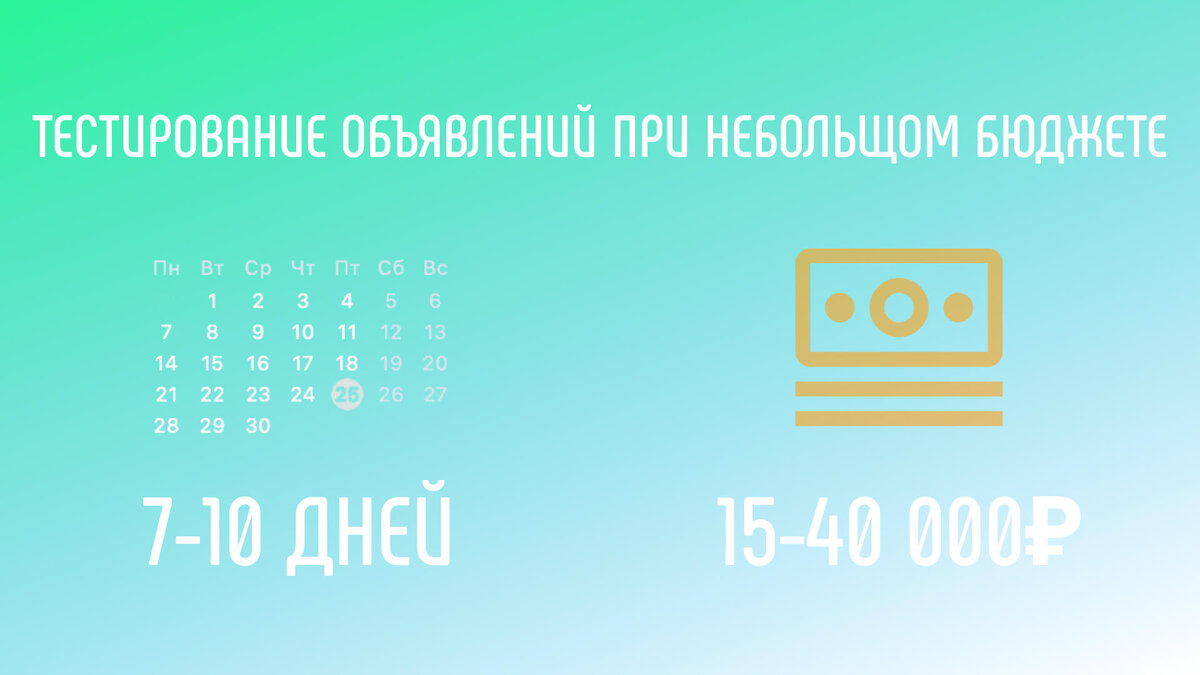 Многие компании считают, что с небольшим бюджетом они не смогут успешно работать с рекламой в Facebook и Instagram. Но с помощью этого метода тестирования, как правило, можно получить действительно хорошее объявление с бюджетом около $250-$500 на тестирование. И вы сможете завершить все тестирование в течение 7-10 дней.