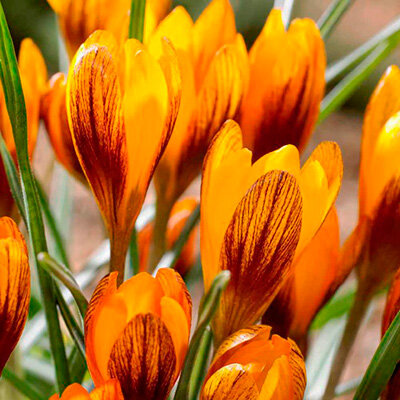 Крокус (шафран) "Орандж Монарх" - раннецветущий, многолетний сорт. Луковицы крокусов среднего размера, отлично приживаются при любых климатических условиях, отличаются обильным цветением. Цветки среднего размера, бокаловидной формы, оранжевого цвета с коричневым обрамлением. Растение неприхотливое в выращивании, невысокое, стебель прямостоячий, крепкий. Крокусы пользуются огромной популярностью из-за своей привлекательности, их выращивают в горшках в домашних условиях, в открытом грунте на клумбах, на балконе.