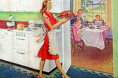 Используя два мощнейших рекламных механизма того времени — кино и печатные издания, власти стали пропагандировать обществу семейные ценности. Если во время войны воспевались женщины-рабочие, то после войны началось агрессивное восхваление неработающих женщин-домохозяек. Были заключены контракты киностудиями, рекламными агентствами и с художниками, которые рисовали моделей в образах идеальных домохозяек.