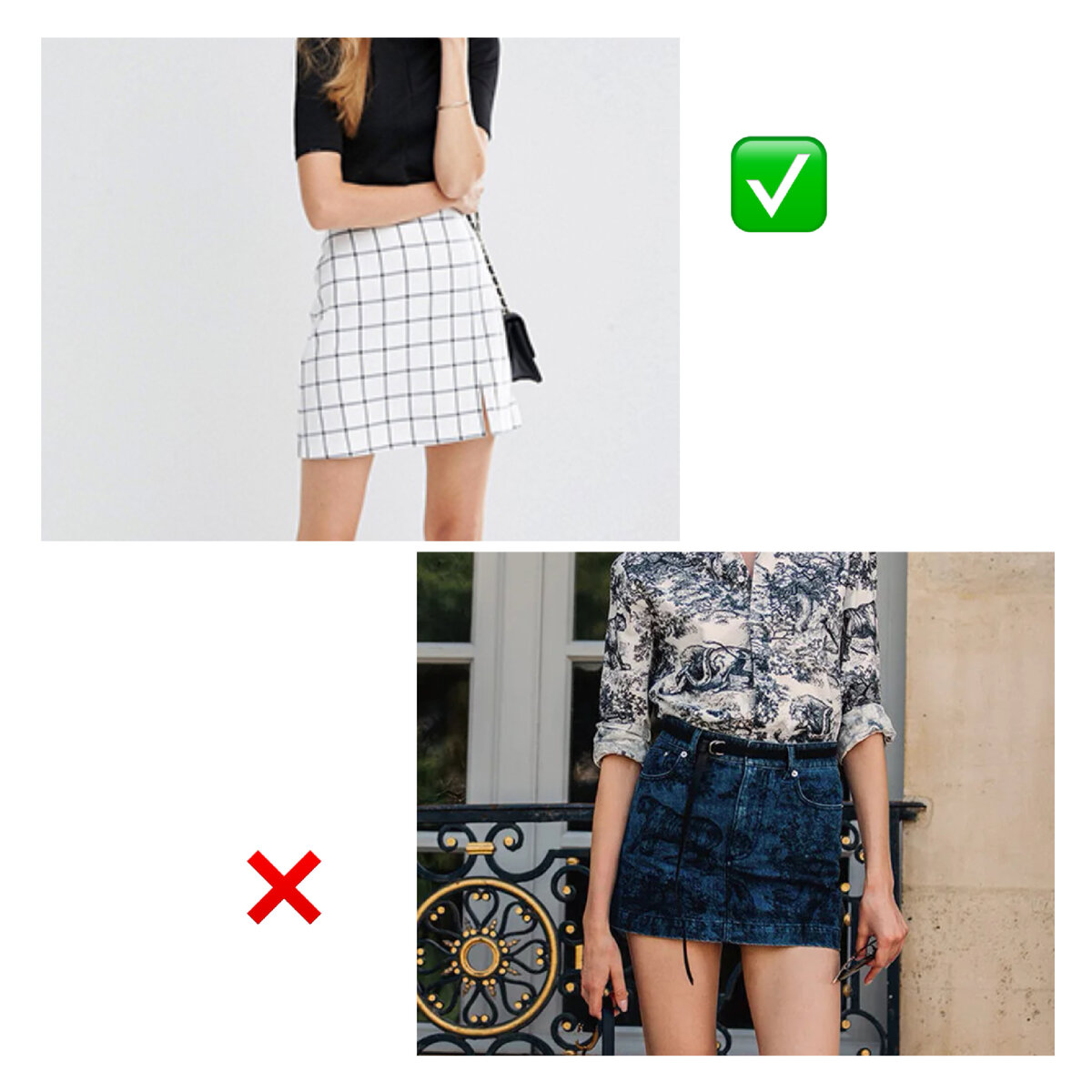 Со своим ростом (160 см) я всегда очень внимательно отношусь к длине при выборе юбки, так как хорошо подобранная по длине юбка может раскрыть все достоинства моей фигуры, а неправильная длина наоборот может все испортить. Выбирая себе юбку, я решила написать этот пост, и, возможно, помочь кому-то при выборе юбки. Начнём с мини Я сейчас не говорю про тот трендовый, на сегодняшний день, вариант мини, который был популярен в 2000-х. А говорю про классическую мини-юбку, которая чаще всего подходит под любой верх и обувь. Идеальная мини-юбка: высокая посадка (выше пупка), чуть свободная, длина до середины бедра. Таким образом высокая посадка не искажает пропорции фигуры, а длина заканчивается на более стройном месте ноги. Чем больше будет облегать юбка, тем не актуальнее будет смотреться образ в целом. Всегда помните про правило воздуха между кожей и одеждой. Недомиди и перемини В голове сразу же всплывают образы во