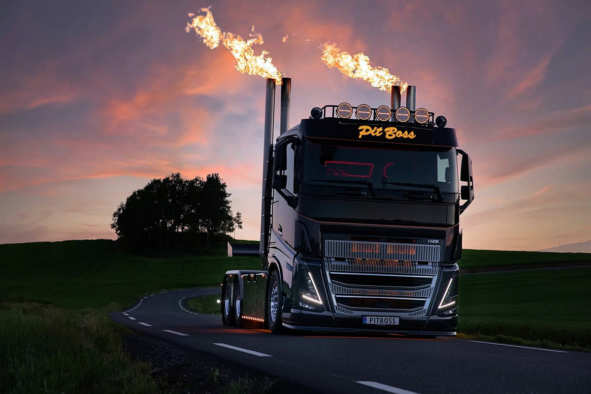 Для чего нужны грузовики? Ответ очевиден: для перевозки различных грузов на дальние и не очень расстояния. Но вот в Норвегии местный представитель компании Volvo Trucks заказал для своих нужд настолько специфический вариант флагманской модели Volvo FH16 750, что пройти мимо, не обратив внимание, просто не получается. Этот автомобиль получил собственное имя «Pit Boss». Нельзя отрицать, что «Босс» заметно отличается от серийного Volvo FH. Это видно не только со стороны, но и при взгляде во внутрь этой машины. Тем не менее, шведский автопроизводитель не стал открещиваться от «переделки» и сделал неплохую рекламу этой премьере. Итак, «Pit Boss» — это трехосный седельный тягач FH16 750, оборудованный кабиной с плоской крышей. Вообще-то ТОП-вая комплектация и такая низкая кабиной сочетаются очень редко. Далее наблюдаем такие интересные дополнения, как установка гриль с газовым баллоном, которые оказались на месте левого топливного бака. На тыловой стенке установлены усилители и колонки очен