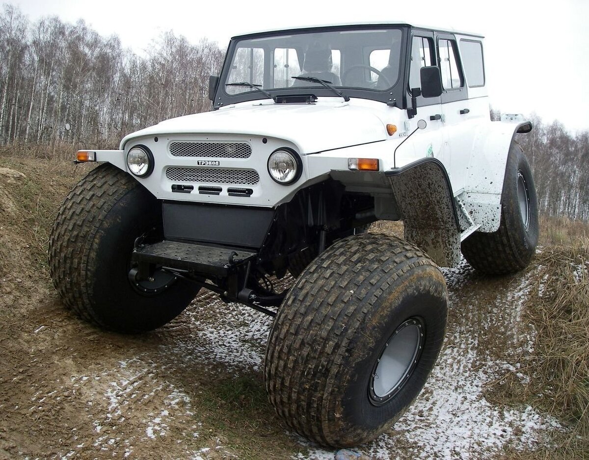 В простонародье, данный внедорожник или вездеход называют русским танком. Поистине, проходимости Трэкола может позавидовать даже боевая машина. Этот вид УАЗа способен передвигаться по болотам, горам и даже плавать. Вседорожная техника популярна у людей, увлекающихся охотой и рыбной ловлей. Вид и особенности конструкции Внешне «Трэкол» напоминает родственную модель «Патриот». Рама от обычного уаза, по-простому и точнее — «буханки», имеется несколько ведущих мостов. Помимо этого, в автомобиле установлена раздаточная коробка, снабжённая пониженной передачей, которая позволяет увеличить проходимость на опасных участках пути. Двигатель дизельный от фирмы — Hyundai. В комплектацию входят колёса сверх низкого давления, позволяющие не только преодолевать грязь, но и свободно держать на воде автомобиль. Как плав средство машина не является скоростной на воде. Преодолевает водные расстояния со скоростью 3 км\ч. При установке мотора для лодок, темп движения возрастает до 10 км\ч. Топливных бако