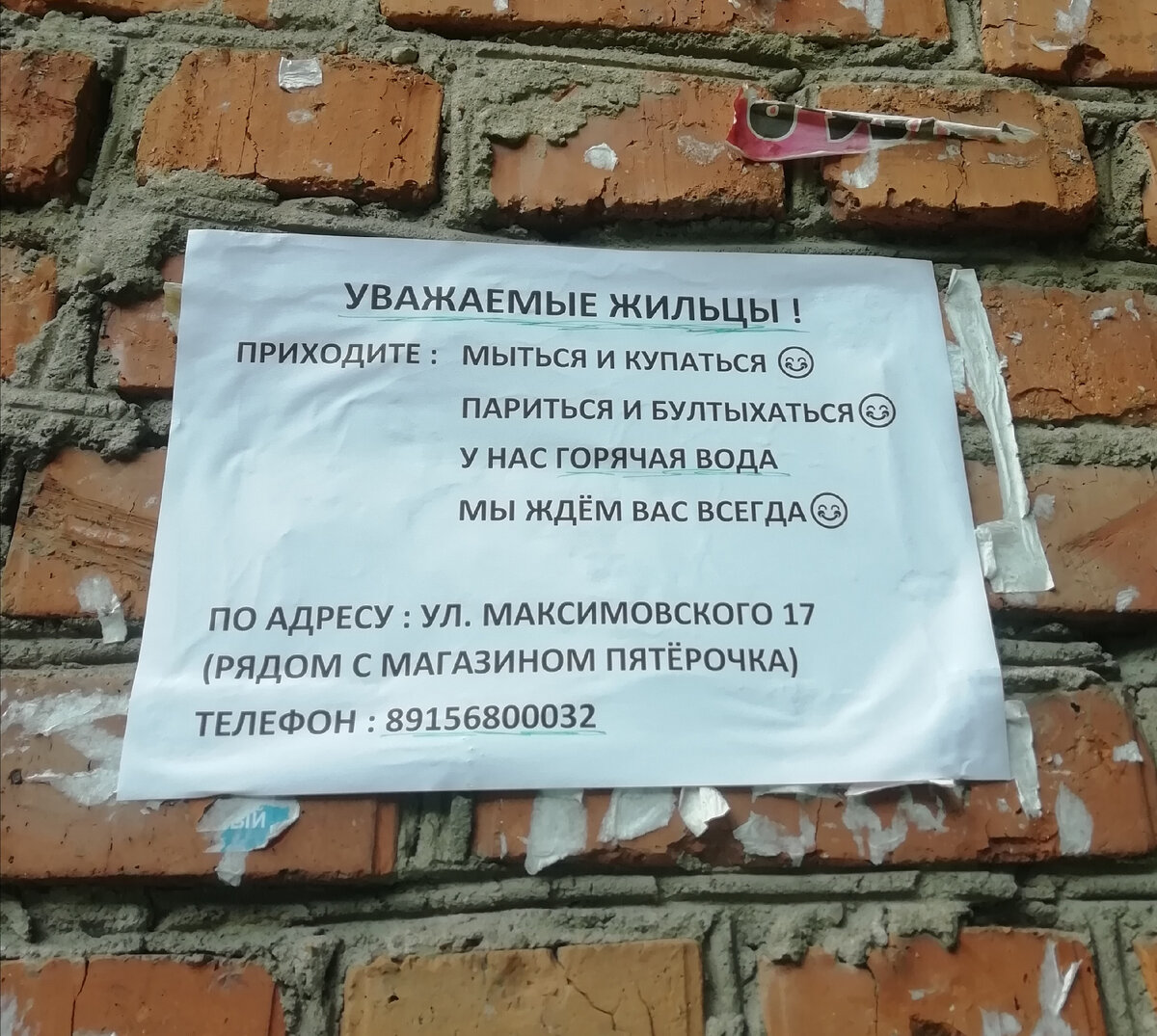 Показываю забавности-необычности с тульских улиц - женщина, бреющая лицо, всевидящее око на стене, загадочное сердце в окне... Одна из примет лета - отключение горячей воды в многоэтажках. Но выход есть: Другая примета лета - жара 30+. Вот так гуляешь в обед и думаешь о палящем солнце, что как-то оно чересчур. Бросаешь взгляд вниз, а асфальт тебе отвечает: И третья примета лета - ягоды. Продавцы на рынке не скупятся на эпитеты: Теперь давайте просто пройдёмся по улицам. Я уже как-то показывала, как задорно у нас выглядит фон городской афиши. Сейчас его "лента" обновилась: Интригующий обрывок объявления. Любопытно, о чём был основной текст? Периодически хожу мимо одного дома, где балконное окно украшает изображение сердца. Всё думала, почему оно там, как будто послание для кого-то. А недавно на соседнем окне появился лист бумаги: Что же там? Подошла посмотреть поближе. Разгадка была прозаична: это не жилая квартира, а салон красоты))) На бумаге - услуги. Ещё из загадочного - послед