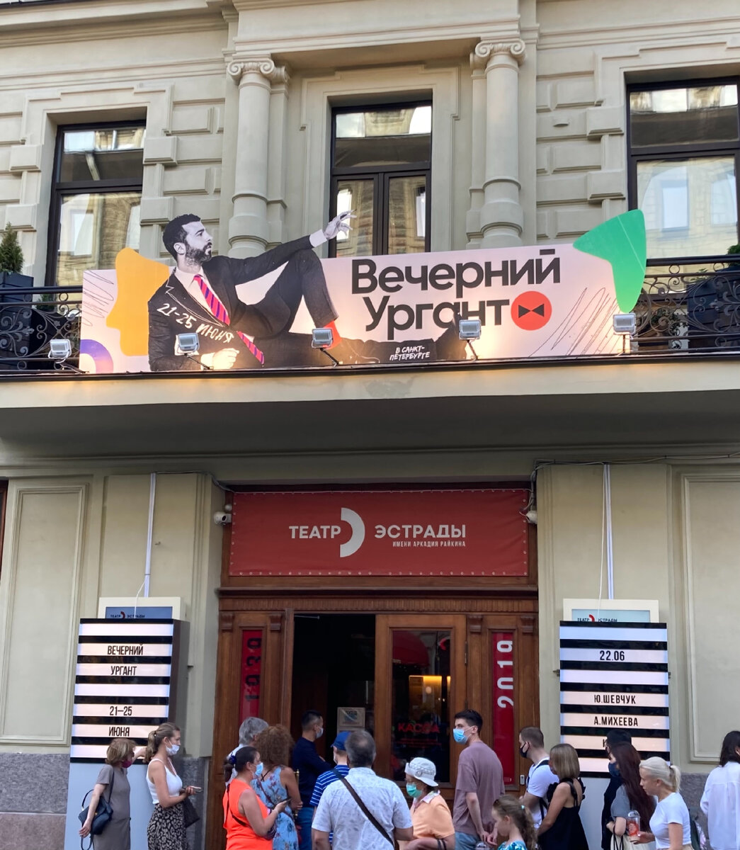 «Камер, мотор!» - на этом мое представление о телесъемках заканчивается. Тем интереснее было оказаться зрителем программы «Вечерний Ургант» и понаблюдать весь процесс воочию. Я не смотрю телевизор, но как-то одним утром, совершенно неожиданно муж заявил, что записал нас на съемки программы «Вечерний Ургант». Приоткрыть завесу тайны, как проходят телесъемки хотелось, и несмотря на то, что поздно вечером у меня был самолёт в командировку, было принято решение идти. Вообще в Санкт-Петербурге съемки этой передачи - большая редкость, поэтому можно считать удачей, что нашу заявку подтвердили. К 18 часам необходимо было явиться ко входу театра имени Райкина. Отпросившись с работы, я закинула вещи в камеру хранения, и помчалась в сторону театра. Подошла я минут за сорок и рассчитывала заглянуть в пышечную на Конюшенной, но перед входом уже образовалась неслабая очередь. Пришлось отказаться от пышек и занять в ней место (ох, и любит наш народ прийти пораньше и застолбить местечко). Запустили