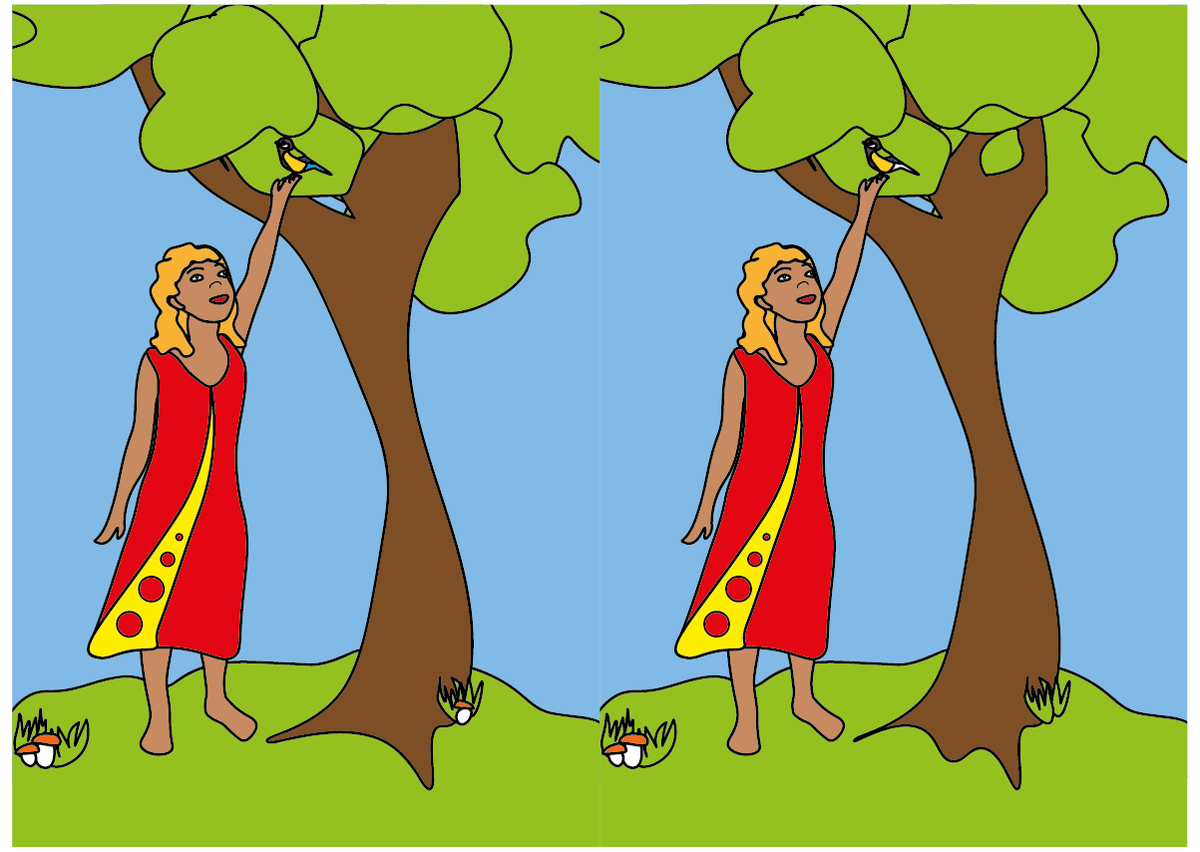 Девочка с синицей в руках на двух почти одинаковых картинках. Найти пять отличий сможет только самый зоркий.