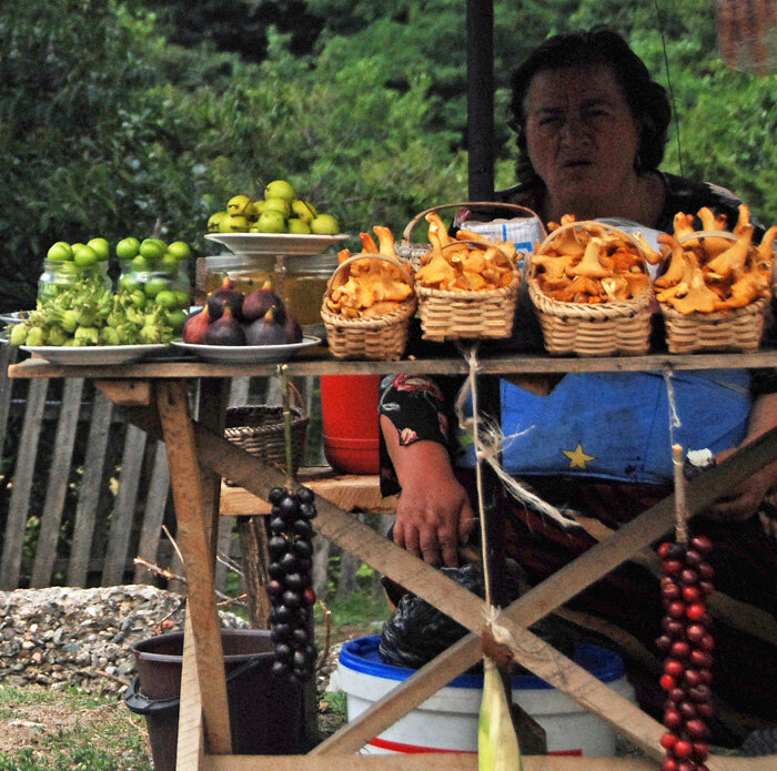 Наша следующая поездка на Грузинский Кавказ привела нас в небольшую провинцию Рача, известную своей традиционной культурой, медом и вином. Беглый взгляд на придорожные прилавки с едой, и мы уже видим горы слив, инжира и яблок и лисичек: А вот и знаменитый рачинский мед. Десятки пасек разбиты вдоль главной магистрали. Мед производят в основном из акации и горных цветов, и вы можете купить банки, содержащие целые соты. Конечно, ни одно путешествие не будет полным без панно, возвеличивающей ценности советской Грузии: семья, мир и много вина. Мы даже нашли Бабу Ягу ! Оказывается, она ушла на покой на заброшенной советской фабрике недалеко от Амбролаури: Наконец мы добрались до Амбролаури, региональной столицы Рача. Изящная «скульптура» на главной площади подтверждает, что наша цель близка: самое известное вино региона готовят в близлежащем селе Хванчкара, название которого позаимствовало знаменитое вино. Хванчкара - красное полусладкое вино, изготовленное из винограда сортов Александрия и