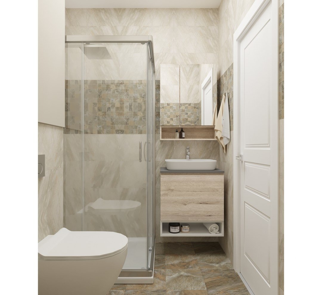 В наше время маленьким санузлом никого не удивишь. Но как сделать из 4 кв. м. зону красоты, комфорта и функциональности? Ответ простой. Для начала мы отказались от классической ванны в пользу многофункционального душа. Подвешенный мойдодыр, а не на ножках, оптически увеличивает пространство в небольшом санузле. Так же наличие открытых полок как в мойдодыре так и в зеркале делает пространство санузла более просторным. Обязательно устанавливаем инсталляцию, а не обычный унитаз. Да, инсталляция занимает больше места, но выглядит красивее, и можно над ней организовать место для хранения разных принадлежностей, как и было сделано в нашем дизайн проекте. Плюс к туалету был выведен дополнительный кран, который превратил туалетную чашу в биде. Два в одном так сказать. Как мы видим, мы максимально использовали наши 4 кв. м., не оставив ни одного уголочка без смысловой нагрузки. Да, в этом сан узле не поместилась стиральная машинка, её можно было бы "засунуть" под раковину, но тогда, весь шарм