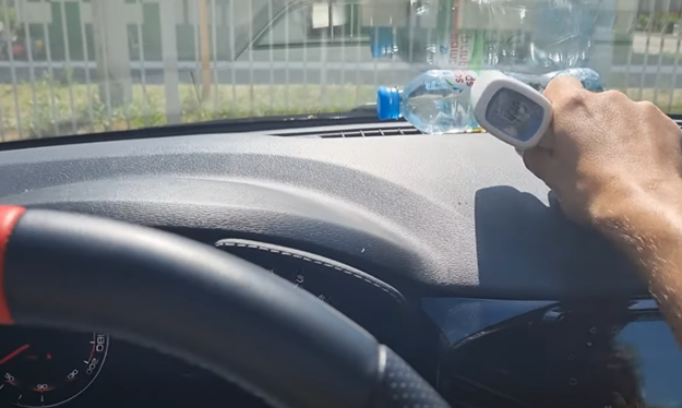 Короткая, но актуальная в жару статья про кондиционер в Ладе Весте. Это новая машина, 4 месяца назад я ее купил. Некоторые пишут, даже если вы берете Весту с кондеем, то это не спасает. Сейчас в салоне нагрелось до +40 градусов на солнце. Специально нагрел бутылку с водой, показываю ее температуру. Получилось 43.9 градусов. Очень жарко в салоне. Включаю кондиционер на 5 минут. Это не климат-контроль, просто кондиционер. Не заправлял его, ничего не делал. Посмотрим, как работает, справляется или нет в 40-градусную жару, и можно ли вообще в такую жару ездить в Ладе Весте. Заведу, оставлю на 5 минут, проверим температуру бутылки с водой после ее охлаждения кондиционером. Заводим автомобиль, включаем максимальный обдув на лобовое стекло. Через 5 минут перемеряем температуру воды в бутылке и посмотрим, справляется или нет кондей, как стало в салоне. Прошло установленное время, в машине стало прохладно. Измеряем бутылку, получилось 37.9 градусов. На солнцепеке бутылка моментально нагревается