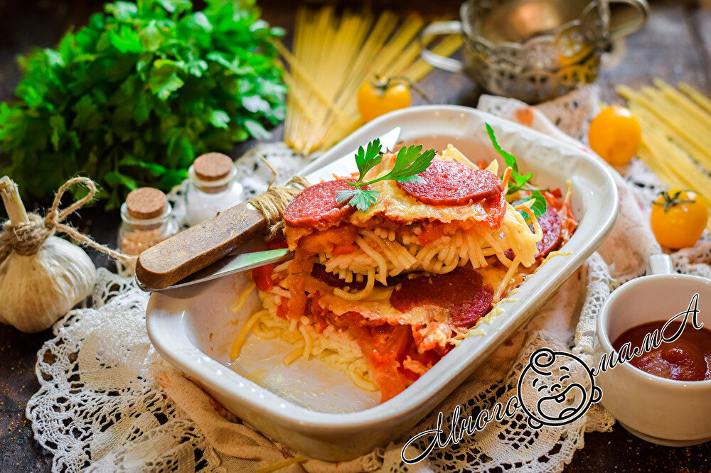 Зашла ко мне как-то в гости свекровь. Время было обеденное. Моя большая семья как раз дружно уселась за стол. Когда я подала основное блюдо и огласила его название — «Бона италиано», свекровь посмотрела удивленно. Настороженно попробовала кусочек и понаблюдала, с каким аппетитом уплетают его внуки. Потом пробормотала себе поднос: «Странное какое-то блюдо…». Но к концу обеда перед ней стояла пустая тарелка. Перед уходом домой свекровь попросила рассказать, как я готовлю эту необычную пиццу. И теперь частенько готовит ее сама. Блюдо получается сытное, потому что в его основе — спагетти. Как оказалось, пиццу можно приготовить и без основы из теста. Я покупаю пасту из твердых сортов пшеницы. Это гарантия того, что она не превратится в липкую кашу в процессе готовки. Одной 200-граммовой пачки хватает на 6 порций. На основу из спагетти я выкладываю традиционные компоненты пиццы: пару помидоров, болгарский перец, салями или пепперони. Колбасу можно купить сразу в нарезке или от общего куска