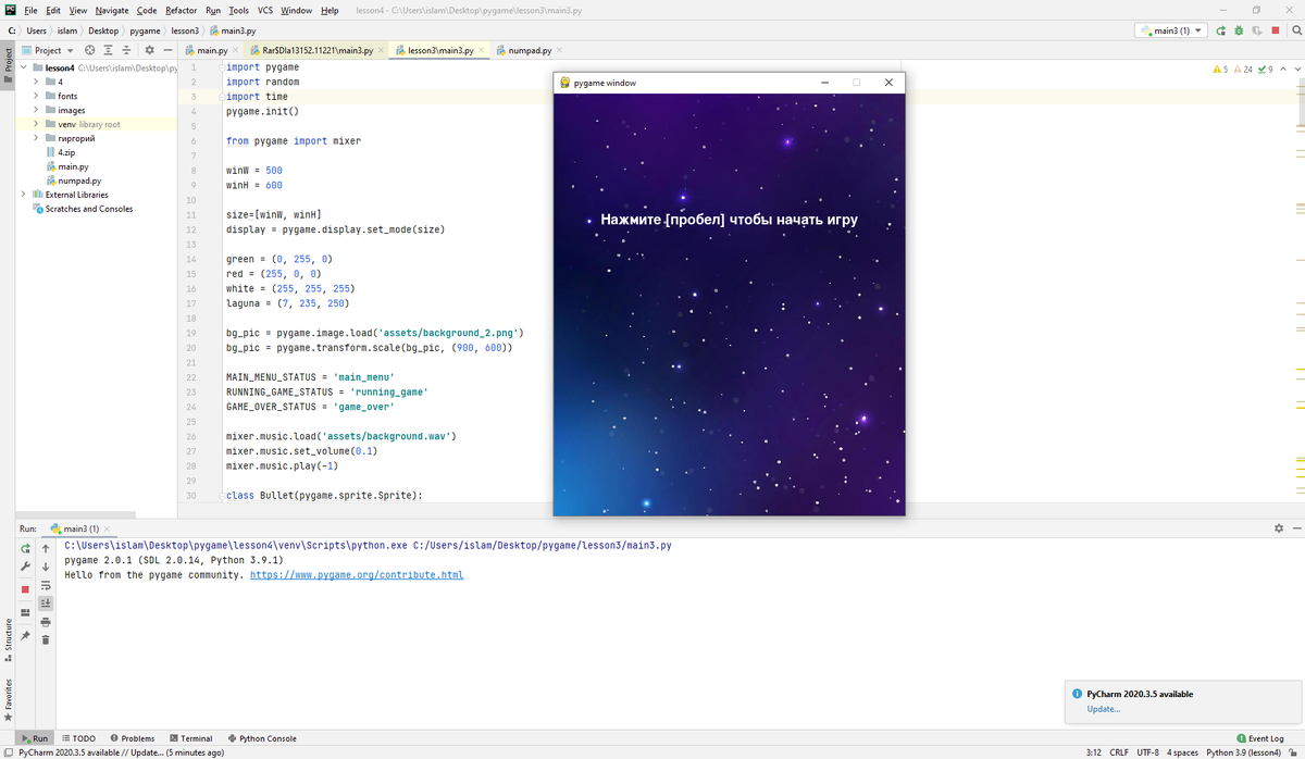 Всем привет. Совсем недавно у нас было обучение по разработке 2D игр на python при помощи библиотеки pygame. На курс пришли ребята разного уровня, кто-то уже умел программировать на неплохом уровне, а кто-то только начал. В любом случае для вхождения в gamedev библиотека pygame довольна хороша. Pygame ограничена в функционале, но его хватает с головой для старта как gamedev-разработчика! Одной из первых игр, которые мы разработали была space invaders, т.е. космические захватчики. Ее суть в том, чтобы уничтожать противников, которые появляются на экране, довольно простая и динамичная игра. Изначально наша игра выглядела очень сыро и непривлекательно, но уже в таком состоянии там была прописана логика игры, поэтому приукрасив ее можно получить вполне неплохую игру! Что собственно и сделал один из учеников, он добавил анимации, изображение текстур, а также музыкальное сопровождение, что сделало игру динамичной и интересной: Если вам интересно, то в одной из следующих статей я могу подробн