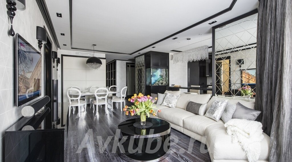 Заказчики поставили перед дизайнером задачу создать гармоничный, элегантный интерьер в современном стиле с элементами ар-деко и классики. Общественные зоны решили выдержать в контрастной черно-белой гамме, а приватные — в спокойных бежевых оттенках. Первоначальное планировочное решение изменили — при входе вместо третьего санузла появилась гардеробная, за счет коридора увеличили хозяйский санузел, который в тандеме со спальней образует основную жилую зону. Гостиная, кухня и столовая объединены, здесь нашли место и для встроенного морского аквариума, и для биокамина и барной стойки. В отделке использованы акценты — черные лаковые двери и кухонная мебель, черная стойка из искусственного камня. Данные акценты смягчены за счет остальной мебели светло-бежевого цвета, светло-серебристой штукатурки и большого количества зеркал, позволяющих зрительно расширить узкие помещения.