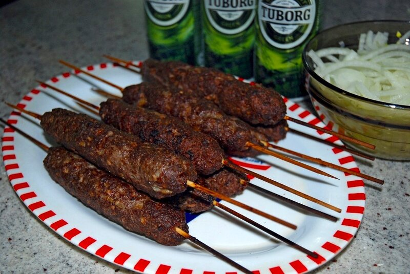 Лучше было бы фарш на это благородное блюдо сделать самому, порубить топориками мякоть баранины или говядины, хорошо отбить, смешать со специями и пожарить на углях, с дымком, но не всегда на это есть время и возможности, потому сделаем это вкусное блюдо дома! Тоже очень вкусно! Самое главное купить или сделать самому хороший бараний или говяжий фарш. Лук мелко порезать, перемешать с фаршем, добавить перемолотые специи, можно мелкопорезанную зелень, посолить, всё перемешать и хорошо отбить. Затем разделить фарш на куски размером с небольшое яблоко, скатать, надеть на шампур или бамбуковую шпажку, сформировать рукой колбаску вокруг шампура. Уложить люля-кебаб на решетку. Поставить в духовку под гриль, при температуре 200-250°С и запекать до появления румяной корочки с каждой стороны минут по 5-10, под низ можно поставить противень с картофелем или другими овощами. К готовому блюду тонко нашинковать лук, промыть холодной водой, добавить мелко порезанную зелен, укроп, кинзу, петрушку, пол