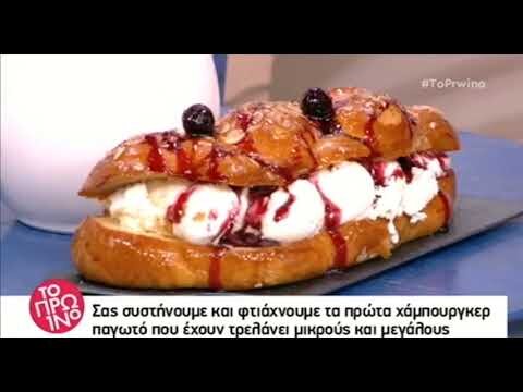 Даже в этом простом десерте, что изобрели первыми итальянцы, греки остаются верны себе. Они используют не простые булочки для бургеров что продаются в любом магазине, а специально выпеченные круглой формы цуреки (τσουρεκι - булочка) по традиционному греческому рецепту. Окунают половинки опять же в традиционный сироп из меда и сока лимона как для приготовления любимые всеми греками и не греками лукумадес (λουκουμαδες - пончики). Посыпают готовый бургер с мороженым по вкусу традиционными орешками. И вуаля! Бургер с мороженным готов. А "вишенкой на торте" выступает, конечно, традиционно говорливая телеведущая утренних программ, которую хочется поскорее заткнуть.