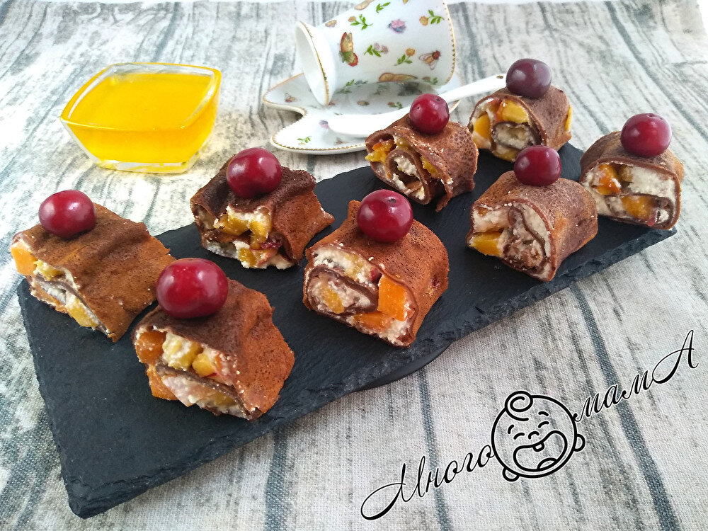 Роллы делаю из обычных блинов и добавляю разные начинки (моя любимая – из персиков и абрикосов)