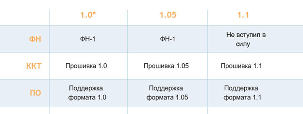 Приказом ФНС № ММВ-7-20/229@ определено 3 версии форматов фискальных документов — 1,0, 1,05 и 1.1. Различия между ними совсем небольшие и заключаются они, по большому счету: