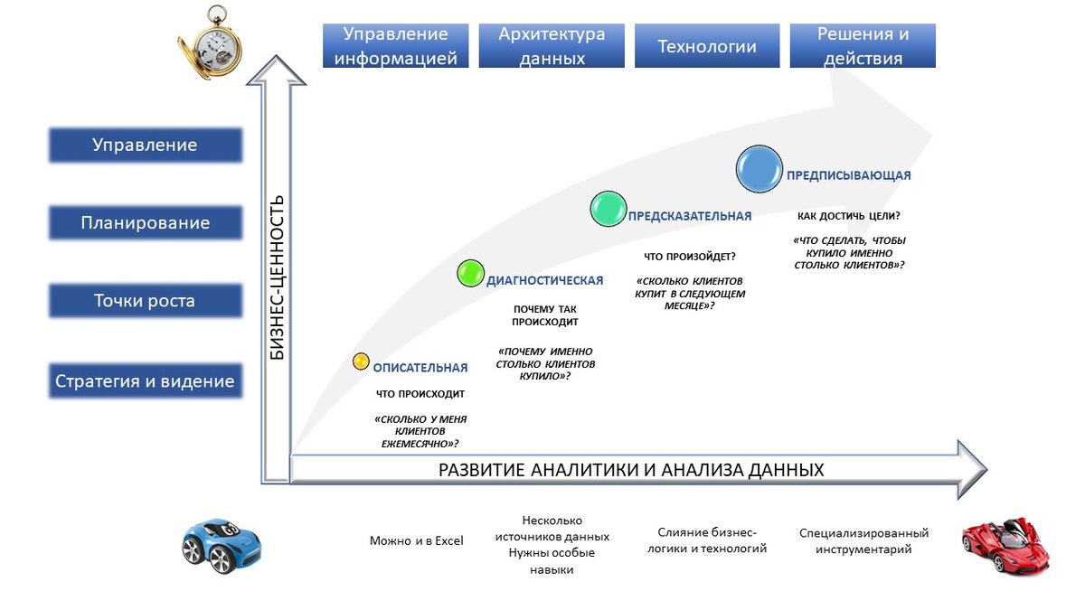 6. Business Intelligence - это комплексный процесс повышения эффективности бизнеса за счет трансформации Вашей информации и данных из пассива (сотрудники тратят время на отчеты в ручную) в актив, когда данные Вам подсказывают что будет и что делать. Но и тут только желания и цели недостаточно, к сожалению. Поскольку это процесс, который затрагивает деятельность всех подразделений организации, то он будет работать при описанном функционале и оцифрованных показателях (те самые KPI), которые покажут путь и динамику достижения цели.