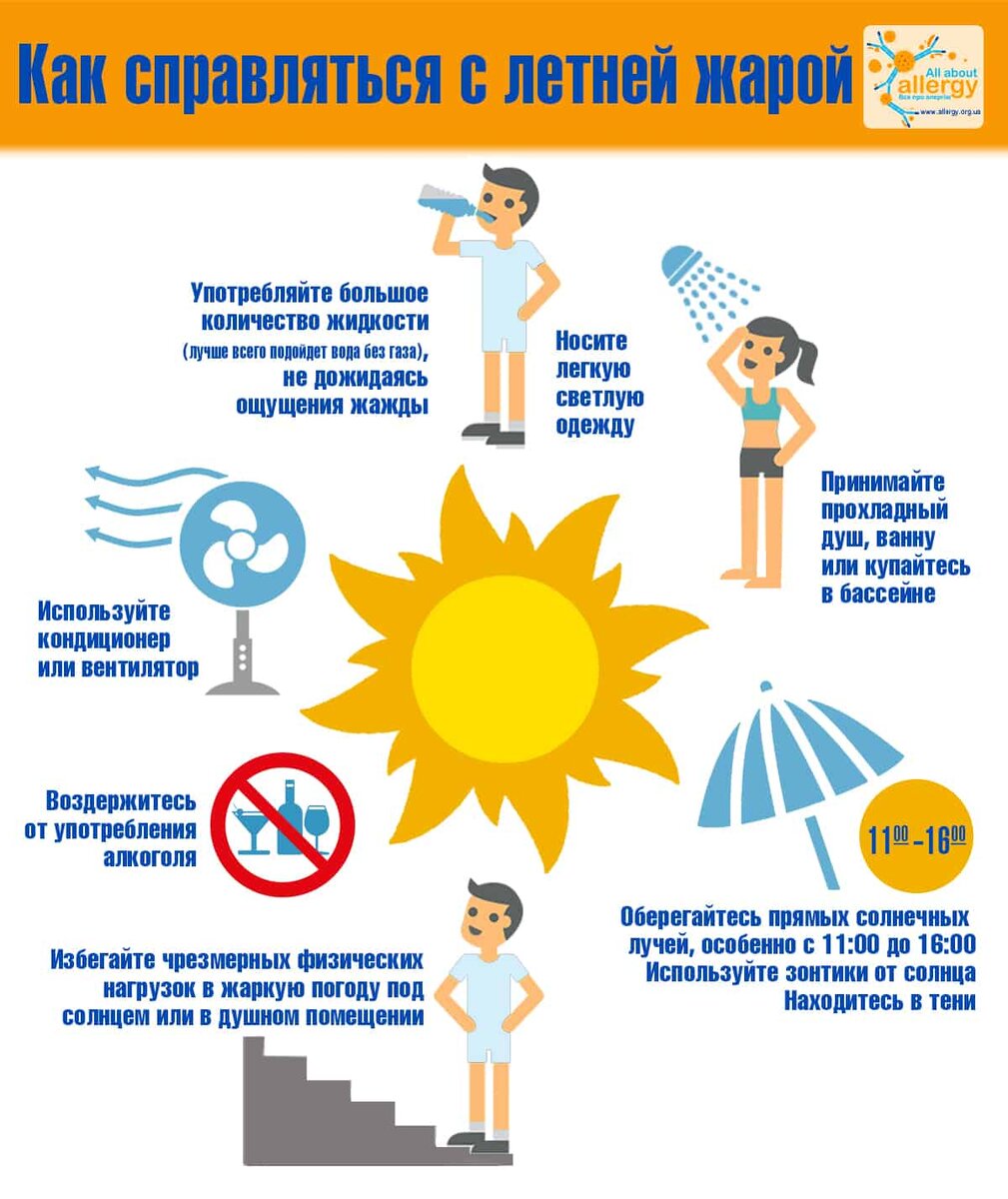 1. Не пейте холодную воду Она не утоляет жажду, вылетает через пять минут вместе с потом, унося с собой соль. Пейте чай или несладкий квас. Про сладкие газировки всё понятно: чем больше пьёшь, тем больше хочется. 2. Если выходите из дома в жару, не делайте резких движений Ведите себя с достоинством: идите плавно, двигайтесь по теневой стороне улицы. Всегда. Ну и главное. Если вы куда-то ходите в жару, то после каждого похода, после каждой прогулки мойте стопы и щиколотки прохладной водой. Там куча биологически активных точек, это приятно и полезно. 3. Пейте холодный чай Завариваете литр некрепкого зелёного чая. Когда он остынет, бросаете туда немного мёда, лимона и мяты. Пьётся это со льдом. Не только вкусно, но и полезно. 4. Если есть возможность, поделите сон пополам Устраивайте себе сиесту в самое жаркое время. Ну и, разумеется, никакого алкоголя на солнце. 5. Старайтесь находиться дома С 11 до 16 часов не выходите на улицу, и уж тем более не стоит загорать в это время суток или на
