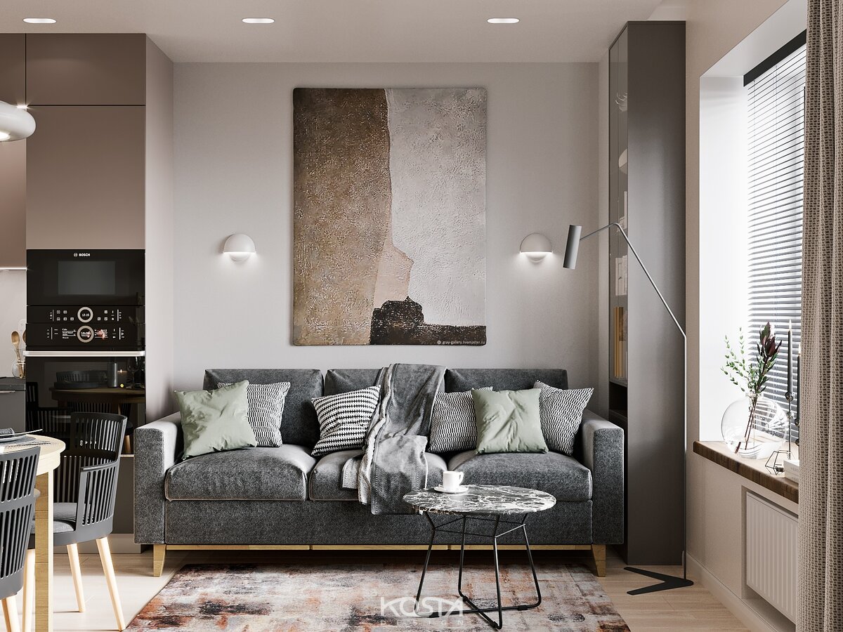 Уютный, современный и светлый проект для семейной пары с ребенком. Пожелания: угловая кухня, пастельные тона и серые оттенки. Стиль: современный, скандинавский. Лаконичная кухня, зона столовой и гостиной объединились в одном помещении. Спокойные приглушенные оттенки, удачное освещение и текстурные элементы добавили ощущение уюта. Продуманные места для хранения и встроенные бытовые приборы обеспечили просторность и легкость интерьера. Взрослая и детская спальни выполнены в спокойных пастельных тонах, которые не выйдут из моды и вряд ли смогут наскучить владельцам. Балкон, с рабочим местом и зоной отдыха, сэкономил пространство и добавил еще одно жилое помещение. А гардеробная комната разрешила проблемы хранения и «визуальных шумов».