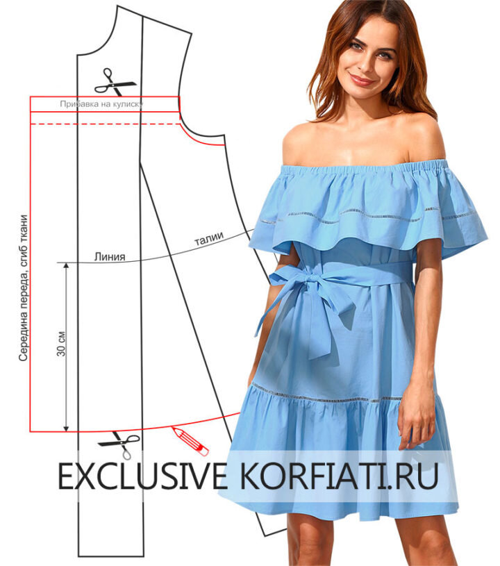 В этом сезоне очень популярны платья и топы с открытыми плечами. Используйте принцип моделирования фасона, который вы изучите в этом уроке и создавайте свои собственные «воздушные» шедевры. В моделировании и пошиве такого платья нет никаких сложностей, поэтому вы сможете самостоятельно сшить его буквально за час. По верху лифа выполнена широкая кулиска, в которую вдевается резинка, платье достаточно свободное, и никакие дополнительные застежки не требуются.