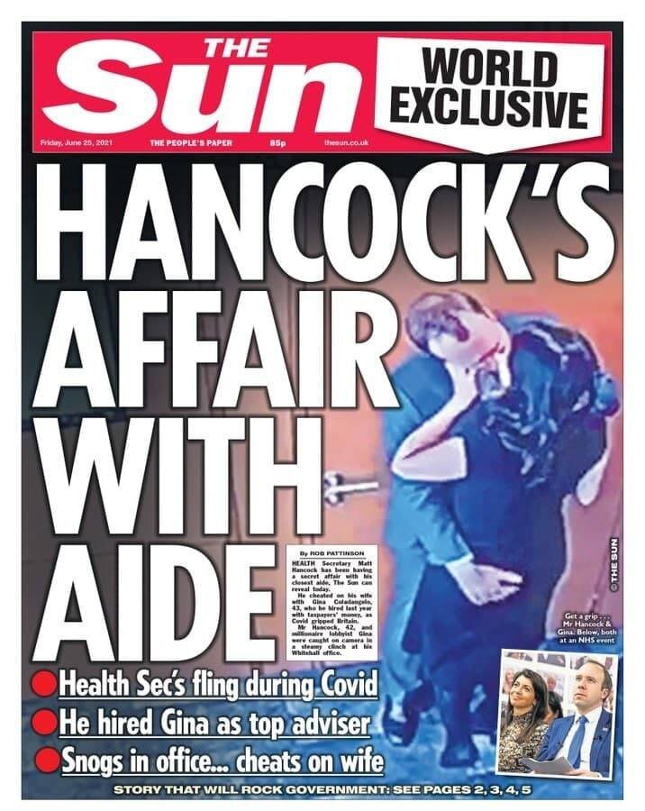 Глава британского минздрава Мэтт Хэнкок заявил об отставке после того как накануне газета Sun опубликовала фото, на котором отец троих детей, 42-летний женатый министр и его помощница, мать троих детей, 43-летняя жена миллионера Оливера Тресса Джина Коладанджело, обнявшись, целуются в одном их помещений здания минздрава. Он признал, что нарушал правила социального дистанцирования, встречаясь с любовницей. Правительство Британии проведет расследование обстоятельств утечки в СМИ записей с камер наблюдения в министерстве здравоохранения.