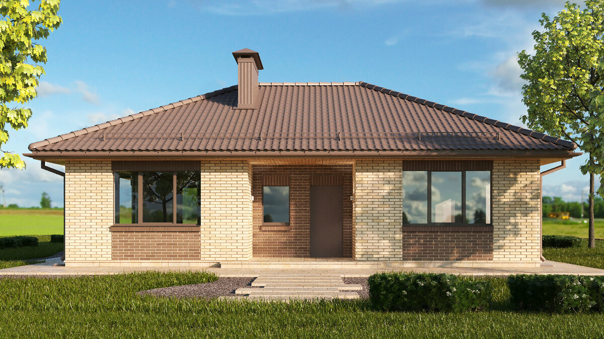 Этот проект был предложен к показам в системе 0,5 млн раз. Это мой рекорд. Не говоря уже о перечисленных выше показателях. В чем же секрет этого проекта? Почему он так нравится читателям? Есть несколько плюсов: 1. Доступные цвета облицовочного кирпича и всеми любимая схема. 2. Не раздутая квадратура. Всего 100 м2. 3. Любимая 4-х скатная вальмовая крыша. 4. Удачная и эргономичная планировка. Оригинальное название статьи: "Можно сказать дом-"ПРИНЦ" среди одноэтажных и это при том, что в 99 м2 есть 3 спальни, терраса и стеклянный эркер"