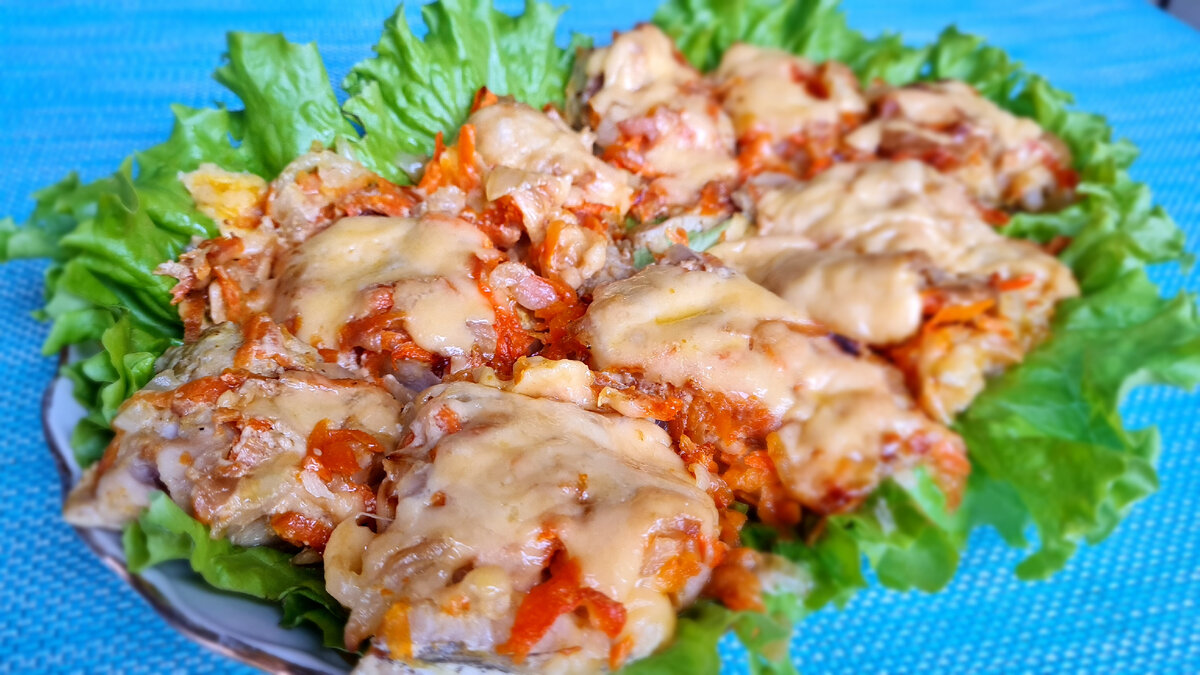 Рыба по - французски в духовке! Ингредиенты: 800 г Филе минтая 1 шт Морковь 1 шт Лук 1 ст л Горчица 1 ст л Сметана 1 ст л Соевый соуса 50 г Твёрдый сыр 20 мл Масло растительное соль, специи по вкусу Рыбу (минтай) разделать на филе без костей. Выкладываем рыбу в форму для запекания. Солим и добавляем специи. Лук почистить и мелко нарезать, затем в течение 2 минут пассеровать в небольшом количестве растительного масла. Морковь очистить, натереть на средней терке и отправить пассировать вместе с луком до готовности. После этого рыбу чуть-чуть посолить. В отдельной форме соединением сметану, горчицу и соевый соус. Готовым маринадом смазываем кусочки рыбы в форме. Поверх выкладываем пережаренные овощи. Смазываем маринадом. Сверху натираем сыр. Разогреваем духовку до 180 градусов. Ставим в нее рыбу на 25-30 минут Блюдо готово. Можно кушать. Приятного Всем Аппетита!