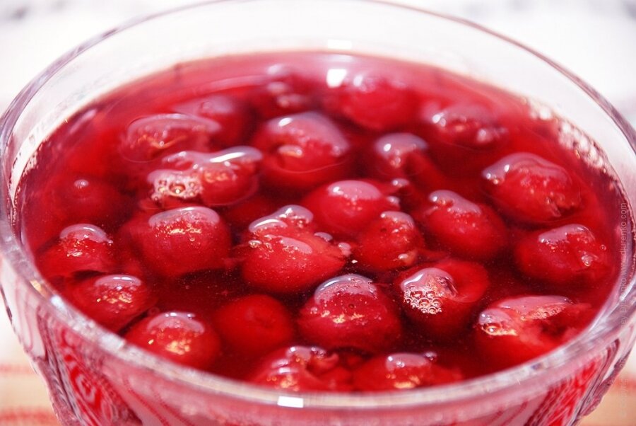 Вишневое желе - не только вкусный десерт, но и потрясающее лакомство, способное немного освежить в жаркую пору. Готовят его летом и зимой в особенности для детей, но и взрослые не против им полакомиться. За основу берутся ягоды, вода, сахар и желатин. Ингредиенты: Вишня — 200 Грамм Желатин — 20 Грамм Сахар — 0,5 Стакана Вода — 300 Миллилитров Количество порций: 3-5 Как приготовить "Вишневое желе" 1. В сезон ягод желе лучше делать своими руками - оно и вкуснее, и полезнее и самое главное - натурально! Если у вас зимой есть замороженные вишни, вы также можете сделать из них желе. Для начала вскипятите воду, после чего отправьте в нее ягоды. 2. Доведите до кипения и добавьте сахар, а также разведенный заранее желатин. Снова доведите до кипения и снимите с огня. 3. При помощи шумовки извлеките все ягоды и разложите из по формочкам. Я привыкла готовить желе в стеклянной емкости (красивее и хранится дольше). 4. Залейте сиропом с желатином и дайте полностью остыть. После этого
