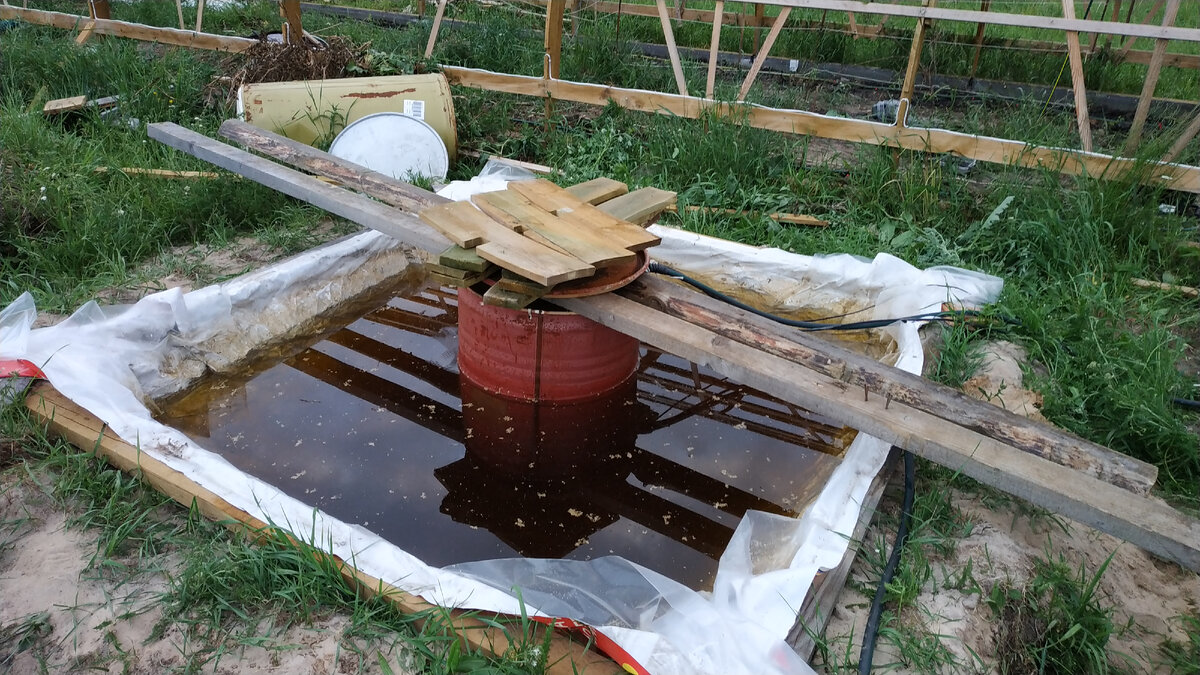 Июнь 2021. В какой-то не очень подходящий момент водоснабжение сказало своё "фи". Напор воды, подаваемой из пруда, резко уменьшился. Пошел, посмотрел, опечалился 🙄. Насос сорвался с поплавка и упал на дно. Похоже, что несмотря на фильрующую сетку, туда попало много грязи. И поэтому напор-то и упал. Сетка сделана, на самом деле, из противокомариной сетки, в два слоя, поэтому не защищает от мелкой взвеси. А когда насос упал на дно, то во время работы как раз этой взвеси очень много поднимал и тут же в себя засасывал.