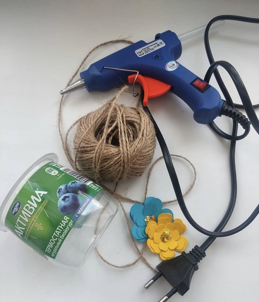 Что нам потребуется: 1 клей пистолет 2 верёвка 3 баночка 4 цветочек ( любой декор) Берём старую баночку или стаканчик и отчищаем от этикетки. После чего нам понадобиться клей пистолет и верёвка. После того ка разогреется клей начинаем аккуратно наносить клей на баночку и обклеивать верёвкой. После того как вы полностью обклеите верёвкой стакан, можно приклеить цветочек на баночку.