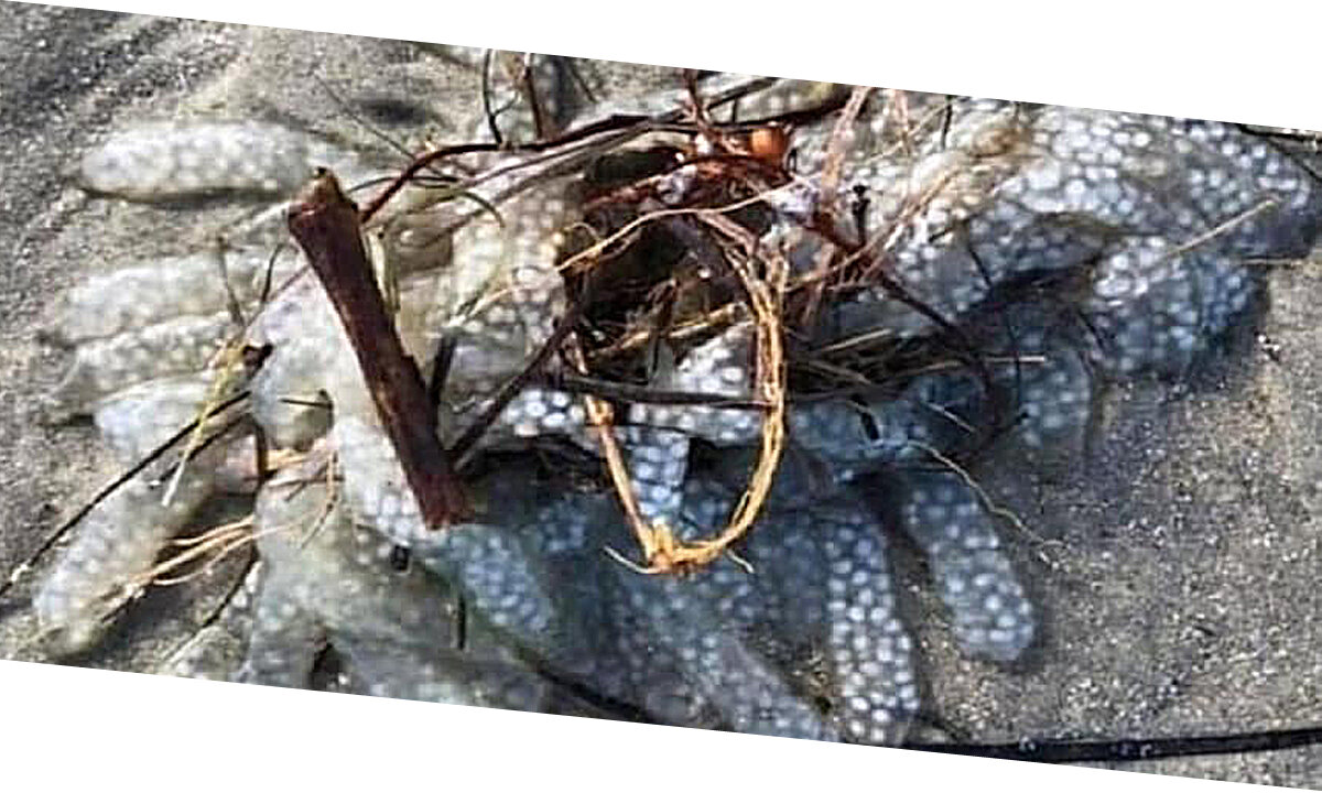 Житель Северной Каролины прогуливаясь по морскому побережью обнаружил неизвестное творение моря. О своей находке он тут же сообщил рейнджерам из Кейп-Лукаута. Когда те прибыли на место, то были не менее удивлены подобной находке. Рейнджеры пребывали в замешательстве по поводу того, что же это могло быть. И тогда они сделали несколько фотографий и выложили в Facebook с просьбой помочь определить что это за существо. Пользователи стали присылать свои версии. Внешне это нечто напоминает множество пальцев или прозрачных мешочков, в которых находится сотни белых шариков. Существо выглядит очень причудливо. Рейнджерам прислали сотни сообщений с предположениями о том, что же это за существо. Тем не менее, специалисты изучив эту странную массу, пришли к выводу, что это может оказаться кладка яиц кальмара. Которую выбросило на берег приливной волной. Теперь рейнджеры наблюдают за кладкой, в надежде, что из этих яиц появятся маленькие кальмары. Специалисты предполагают, что данная кладка яиц отн