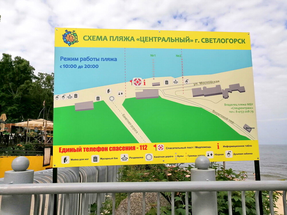 Выдался жаркий день, и мы решили продолжить тестирование пляжей Калининградской области. На очереди был пляж в Светлогорске, одном из главных курортов области. Приехали в город утром. Столбик термометра постепенно полз к отметке в 30 градусов. Народа было не много в эти утренние часы. Температура воды, согласно показаниям, вывешенным на спасательном пункте, была 20 градусов. К пляжу можно попасть двумя способами на фуникулере и пешком. Мы выбрали второе. На подходе через крышу пятизвездочного отеля, расположенного на променаде, стало просматриваться море. Сам пляж тянется, чуть ли не от посёлка Отрадного до променада, а потом вдоль променада в сторону Пионерского. Он оборудован спасательной станцией, раздевалками и туалетами. На променаде можно перекусить. Левая часть пляжа, не оборудована лежаками. Это часть в виде дикого пляжа. Центральная часть, оборудована детскими бассейнами и лежаками. Скорей всего, оборудование этой части пляжа, принадлежит отелям, поэтому, народа там почти не б